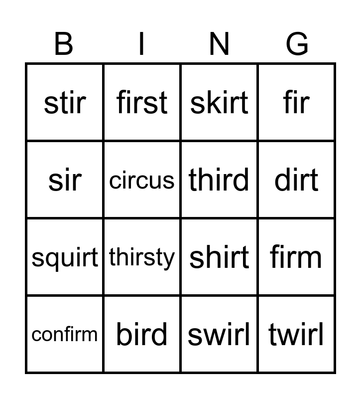 This bingo card has 21 words: bird, girl, first, birthday, swirl, third, stir, skirt, shirt, dirt, squirt, fir, twirl, chirp, circus, circle, confirm, thirsty, sir, firm and smirk.