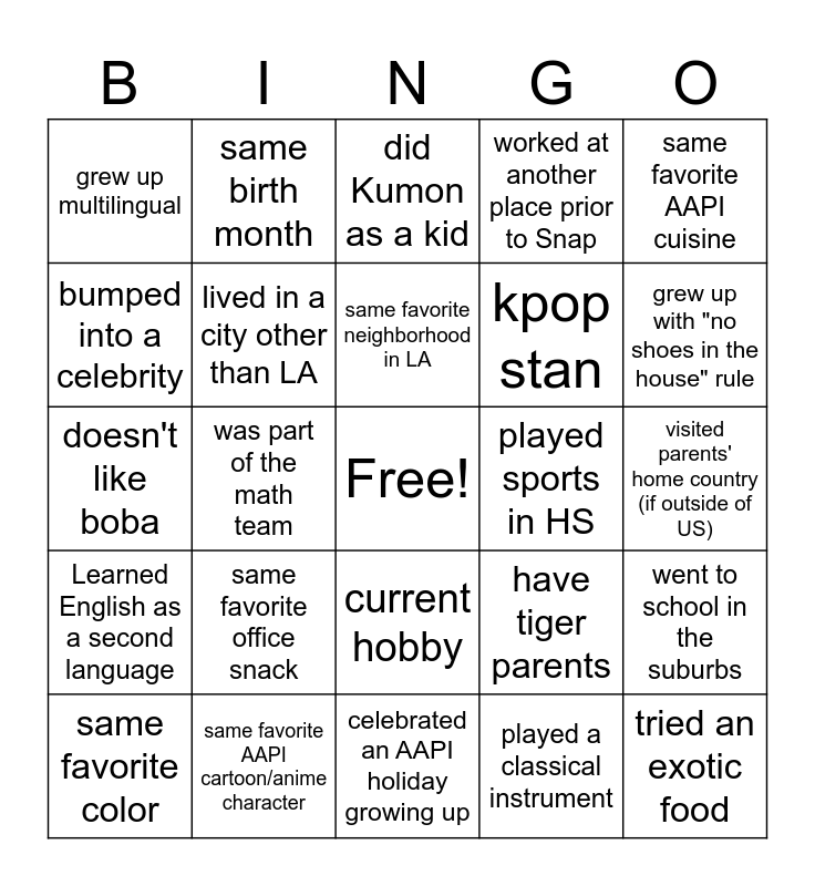 This bingo card has a free space and 24 words: same favorite office snack, same favorite AAPI cartoon/anime character, same favorite neighborhood in LA, same favorite color, same favorite AAPI cuisine, grew up multilingual, bumped into a celebrity, same birth month, played sports in HS, current hobby, kpop stan, doesn't like boba, have tiger parents, went to school in the suburbs, lived in a city other than LA, played a classical instrument, visited parents' home country (if outside of US), did Kumon as a kid, grew up with "no shoes in the house" rule, was part of the math team, tried an exotic food, Learned English as a second language, worked at another place prior to Snap and celebrated an AAPI holiday growing up.