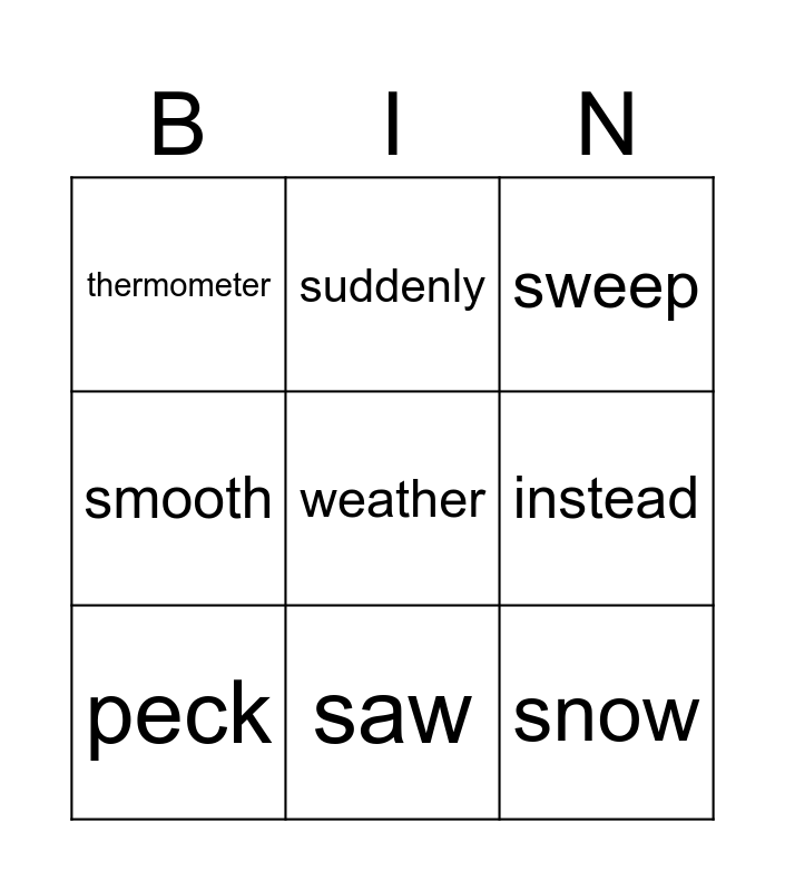This bingo card has 9 words: peck, sweep, suddenly, smooth, thermometer, instead, weather, snow and saw.