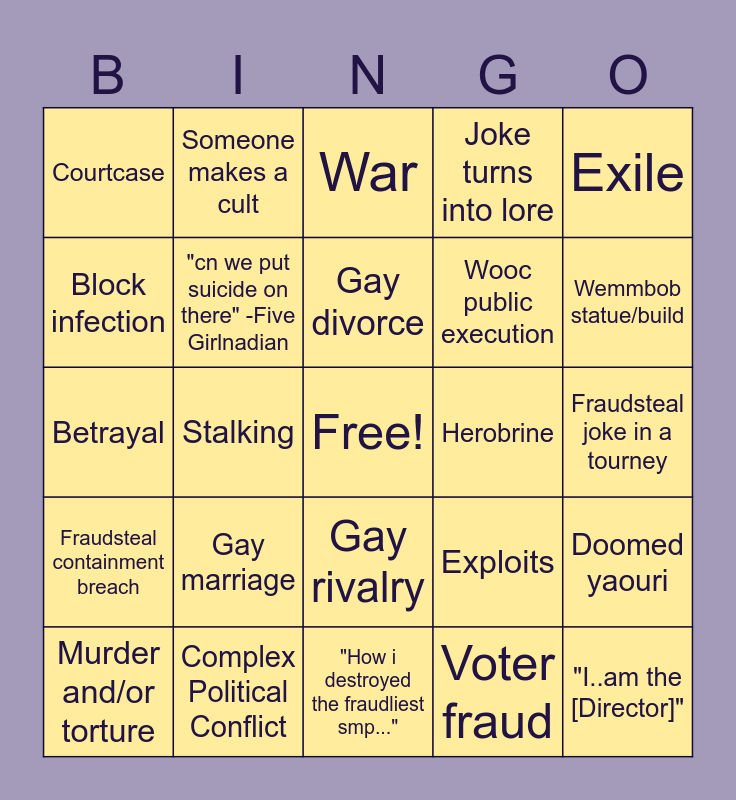 This bingo card has a free space and 24 words: Gay marriage, Complex Political Conflict, Gay divorce, Murder and/or torture, Exile, Courtcase, Block infection, Someone makes a cult, Herobrine, Gay rivalry, Wooc public execution, Betrayal, Exploits, Doomed yaouri, "cn we put suicide on there" -Five Girlnadian, Voter fraud, Fraudsteal joke in a tourney, War, Wemmbob statue/build, Stalking, "I..am the [Director]", Fraudsteal containment breach, Joke turns into lore and "How i destroyed the fraudliest smp...".