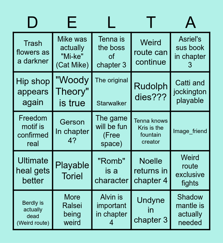 This bingo card has a free space and 24 words: Playable Toriel, More Ralsei being weird, The original Starwalker, Berdly is actually dead (Weird route), Asriel's sus book in chapter 3, Trash flowers as a darkner, Hip shop appears again, Mike was actually "Mi-ke" (Cat Mike), Tenna knows Kris is the fountain creator, "Romb" is a character, Rudolph dies???, Freedom motif is confirmed real, Noelle returns in chapter 4, Weird route exclusive fights, "Woody Theory" is true, Undyne in chapter 3, Image_friend, Tenna is the boss of chapter 3, Catti and jockington playable, Gerson In chapter 4?, Shadow mantle is actually needed, Ultimate heal gets better, Weird route can continue and Alvin is important in chapter 4.