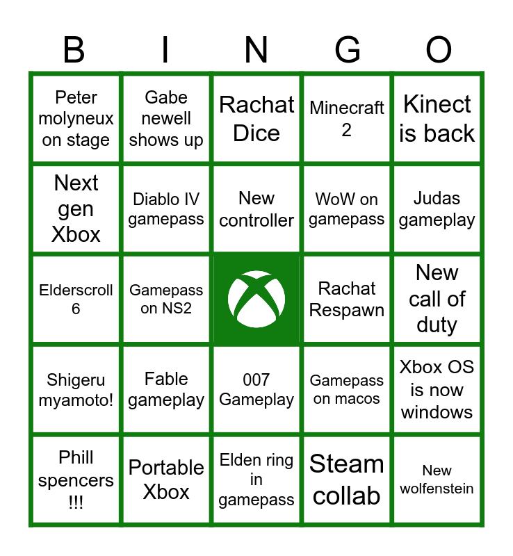This bingo card has a free space and 24 words: Fable gameplay, Portable Xbox, New controller, Phill spencers !!!, Kinect is back, Peter molyneux on stage, Next gen Xbox, Gabe newell shows up, Rachat Respawn, 007 Gameplay, WoW on gamepass, Elderscroll 6, Gamepass on macos, Xbox OS is now windows, Diablo IV gamepass, Steam collab, New call of duty, Rachat Dice, Judas gameplay, Gamepass on NS2, New wolfenstein, Shigeru myamoto!, Minecraft 2 and Elden ring in gamepass.