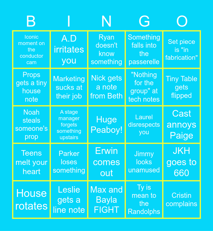 This bingo card has a free space and 24 words: House rotates, Parker loses something, Nick gets a note from Beth, Ty is mean to the Randolphs, Set piece is "in fabrication", Iconic moment on the conductor cam, A.D irritates you, Ryan doesn't know something, Laurel disrespects you, Cast annoys Paige, Noah steals someone's prop, Marketing sucks at their job, Jimmy looks unamused, JKH goes to 660, Props gets a tiny house note, Leslie gets a line note, Max and Bayla FIGHT, Something falls into the passerelle, Tiny Table gets flipped, Teens melt your heart, A stage manager forgets something upstairs, Erwin comes out, "Nothing for the group" at tech notes and Cristin complains.
