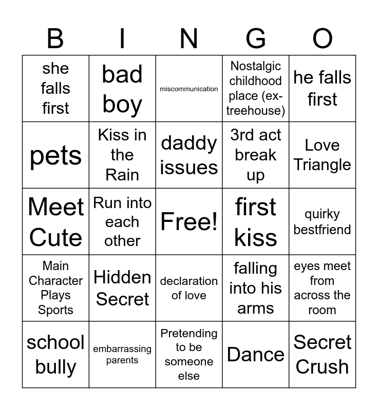 This bingo card has a free space and 24 words: Hidden Secret, embarrassing parents, daddy issues, school bully, he falls first, she falls first, pets, bad boy, first kiss, declaration of love, 3rd act break up, Meet Cute, falling into his arms, eyes meet from across the room, Kiss in the Rain, Dance, quirky bestfriend, miscommunication, Love Triangle, Run into each other, Secret Crush, Main Character Plays Sports, Nostalgic childhood place (ex-treehouse) and Pretending to be someone else.