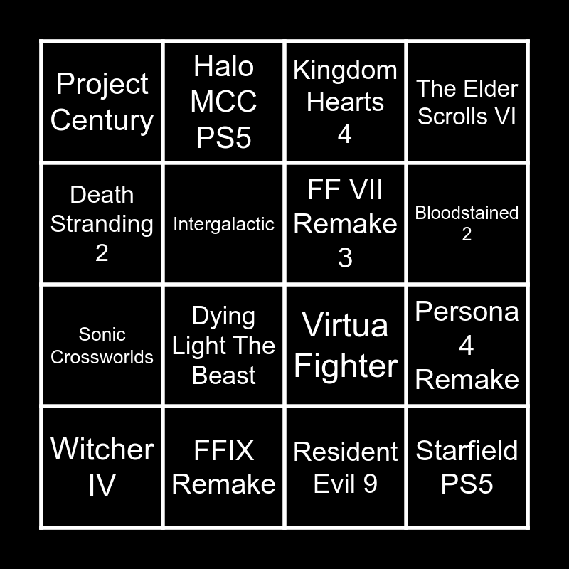 This bingo card has 16 words: FFIX Remake, Persona 4 Remake, Kingdom Hearts 4, Project Century, Sonic Crossworlds, Halo MCC PS5, Virtua Fighter, Resident Evil 9, Death Stranding 2, Intergalactic, Witcher IV, The Elder Scrolls VI, Dying Light The Beast, Bloodstained 2, FF VII Remake 3 and Starfield PS5.