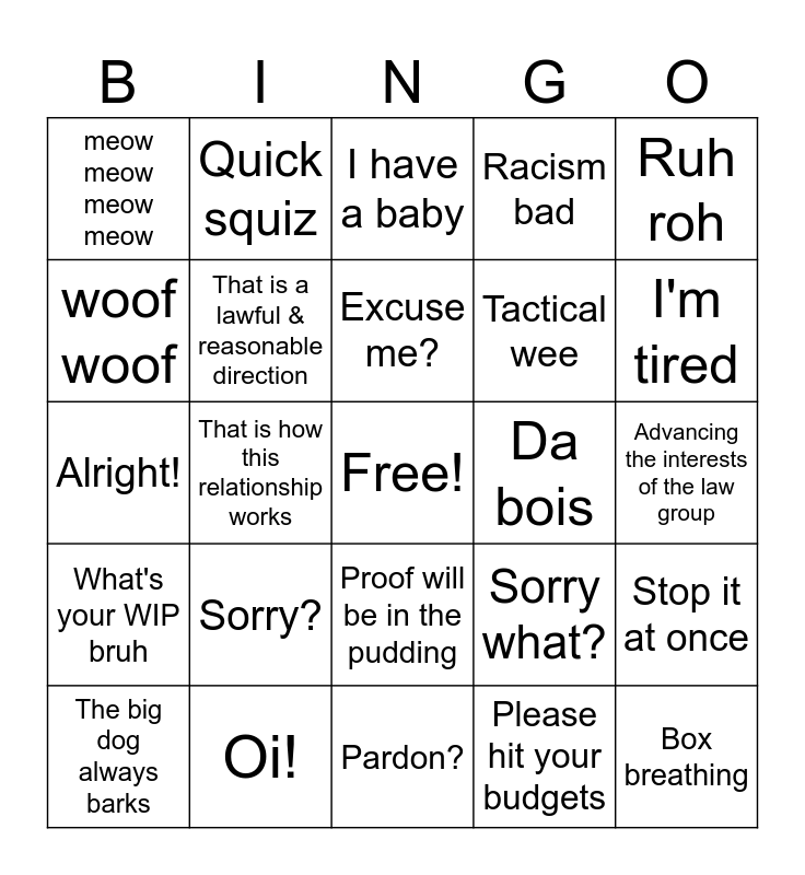 This bingo card has a free space and 25 words: Sorry?, Pardon?, Excuse me?, The big dog always barks, Ruh roh, meow meow meow meow, woof woof, Quick squiz, Da bois, Proof will be in the pudding, Tactical wee, Alright!, Sorry what?, Stop it at once, That is a lawful & reasonable direction, But a moment, Advancing the interests of the law group, I have a baby, I'm tired, That is how this relationship works, Box breathing, Oi!, What's your WIP bruh, Racism bad and Please hit your budgets.