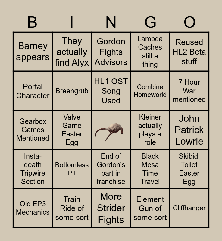 This bingo card has a free space and 24 words: Bottomless Pit, Train Ride of some sort, HL1 OST Song Used, Old EP3 Mechanics, Reused HL2 Beta stuff, Barney appears, Portal Character, They actually find Alyx, Kleiner actually plays a role, End of Gordon's part in franchise, Combine Homeworld, Gearbox Games Mentioned, Black Mesa Time Travel, Skibidi Toilet Easter Egg, Breengrub, Element Gun of some sort, John Patrick Lowrie, Gordon Fights Advisors, 7 Hour War mentioned, Valve Game Easter Egg, Cliffhanger, Insta-death Tripwire Section, Lambda Caches still a thing and More Strider Fights.