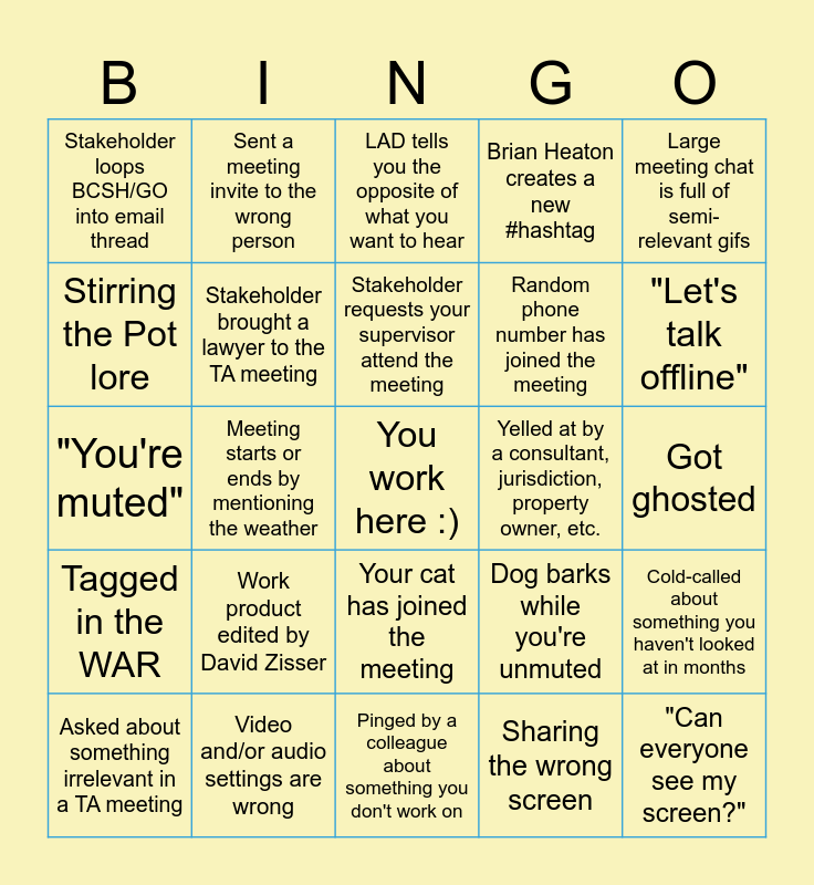 This bingo card has a free space and 24 words: Work product edited by David Zisser, Video and/or audio settings are wrong, Stakeholder requests your supervisor attend the meeting, Asked about something irrelevant in a TA meeting, Large meeting chat is full of semi-relevant gifs, Stakeholder loops BCSH/GO into email thread, Stirring the Pot lore, Sent a meeting invite to the wrong person, Yelled at by a consultant, jurisdiction, property owner, etc., Your cat has joined the meeting, Random phone number has joined the meeting, "You're muted", Dog barks while you're unmuted, Cold-called about something you haven't looked at in months, Stakeholder brought a lawyer to the TA meeting, Sharing the wrong screen, Got ghosted, LAD tells you the opposite of what you want to hear, "Let's talk offline", Meeting starts or ends by mentioning the weather, "Can everyone see my screen?", Tagged in the WAR, Brian Heaton creates a new #hashtag and Pinged by a colleague about something you don't work on.