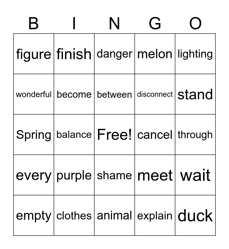 This bingo card has a free space and 24 words: empty, purple, between, explain, lighting, figure, finish, danger, cancel, through, Spring, become, meet, wait, wonderful, clothes, animal, melon, stand, every, balance, shame, disconnect and duck.