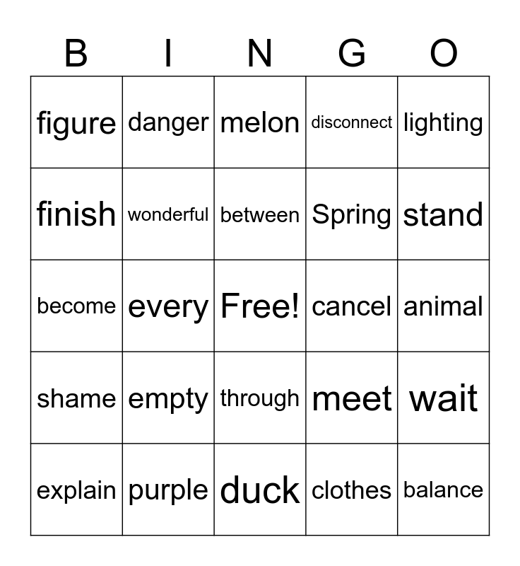 This bingo card has a free space and 24 words: empty, purple, between, explain, lighting, figure, finish, danger, cancel, through, Spring, become, meet, wait, wonderful, clothes, animal, melon, stand, every, balance, shame, disconnect and duck.