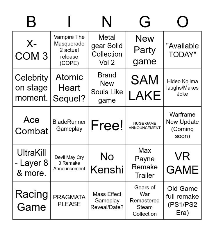 This bingo card has a free space and 24 words: Devil May Cry 3 Remake Announcement, PRAGMATA PLEASE, Brand New Souls Like game, Racing Game, "Available TODAY", X-COM 3, Celebrity on stage moment., Vampire The Masquerade 2 actual release (COPE), HUGE GAME ANNOUNCEMENT, No Kenshi, SAM LAKE, Ace Combat, Max Payne Remake Trailer, VR GAME, Atomic Heart Sequel?, Gears of War Remastered Steam Collection, Warframe New Update (Coming soon), Metal gear Solid Collection Vol 2, Hideo Kojima laughs/Makes Joke, BladeRunner Gameplay, Old Game full remake (PS1/PS2 Era), UltraKill - Layer 8 & more., New Party game and Mass Effect Gameplay Reveal/Date?.