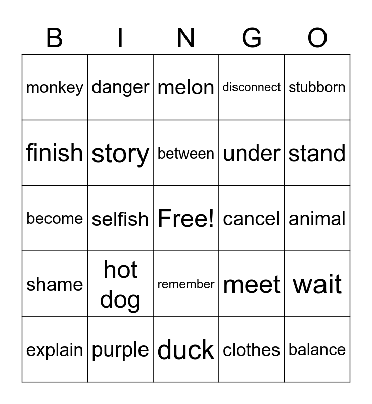 This bingo card has a free space and 24 words: hot dog, purple, between, explain, stubborn, monkey, finish, danger, cancel, remember, under, become, meet, wait, story, clothes, animal, melon, stand, selfish, balance, shame, disconnect and duck.