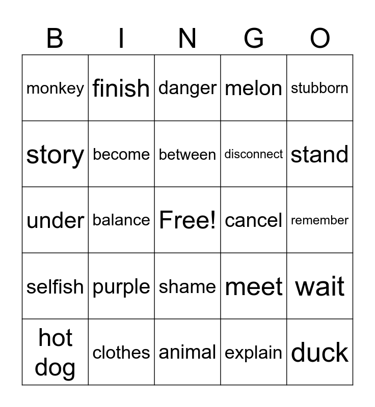 This bingo card has a free space and 24 words: hot dog, purple, between, explain, stubborn, monkey, finish, danger, cancel, remember, under, become, meet, wait, story, clothes, animal, melon, stand, selfish, balance, shame, disconnect and duck.