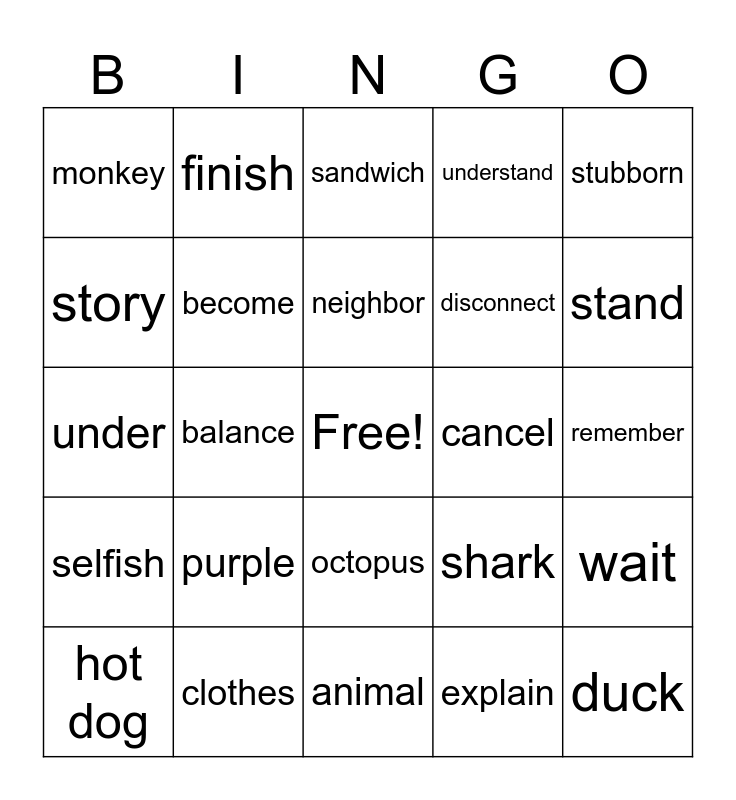 This bingo card has a free space and 24 words: hot dog, purple, neighbor, explain, stubborn, monkey, finish, sandwich, cancel, remember, under, become, shark, wait, story, clothes, animal, understand, stand, selfish, balance, octopus, disconnect and duck.