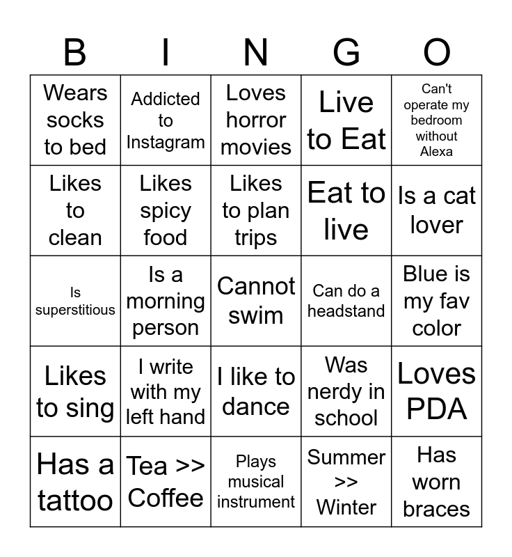 This bingo card has 25 words: I write with my left hand, Plays musical instrument, Likes to plan trips, Has a tattoo, Can't operate my bedroom without Alexa, Wears socks to bed, Likes to clean, Addicted to Instagram, Can do a headstand, I like to dance, Eat to live, Is superstitious, Was nerdy in school, Loves PDA, Likes spicy food, Has worn braces, Blue is my fav color, Loves horror movies, Is a cat lover, Is a morning person, Cannot swim, Tea >> Coffee, Likes to sing, Live to Eat and Summer >> Winter.