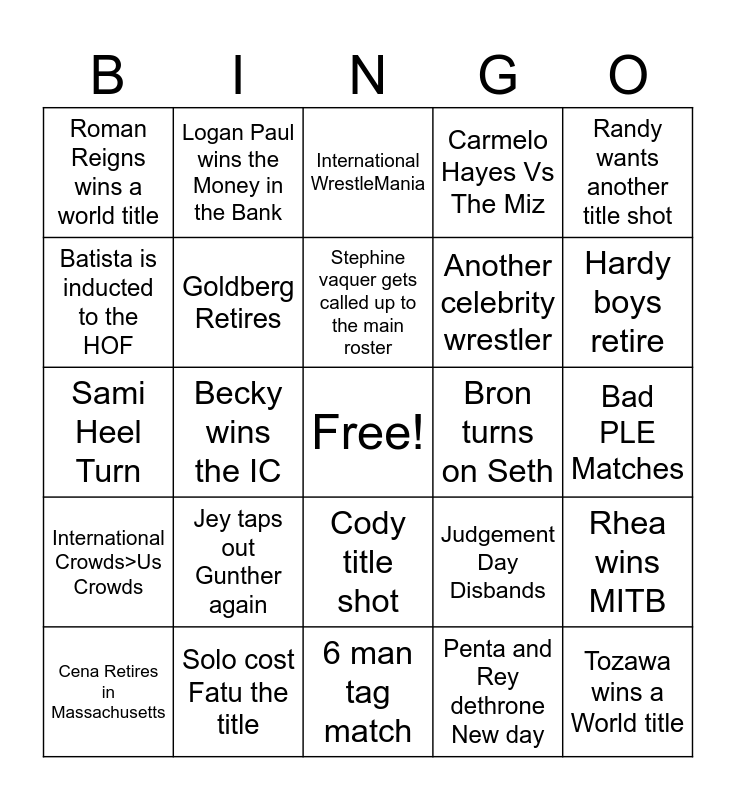 This bingo card has a free space and 24 words: Jey taps out Gunther again, Solo cost Fatu the title, Stephine vaquer gets called up to the main roster, Cena Retires in Massachusetts, Randy wants another title shot, Roman Reigns wins a world title, Batista is inducted to the HOF, Logan Paul wins the Money in the Bank, Bron turns on Seth, Cody title shot, Another celebrity wrestler, Sami Heel Turn, Judgement Day Disbands, Rhea wins MITB, Goldberg Retires, Penta and Rey dethrone New day, Bad PLE Matches, International WrestleMania, Hardy boys retire, Becky wins the IC, Tozawa wins a World title, International Crowds>Us Crowds, Carmelo Hayes Vs The Miz and 6 man tag match.