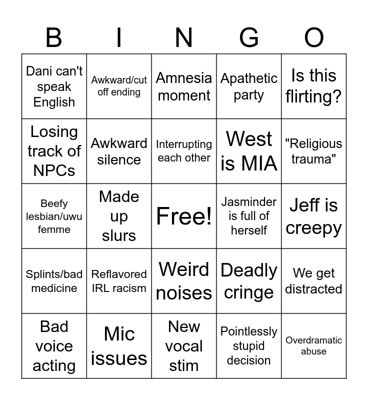 This bingo card has a free space and 24 words: Reflavored IRL racism, Mic issues, Interrupting each other, Bad voice acting, Is this flirting?, Dani can't speak English, Losing track of NPCs, Awkward/cut off ending, Jasminder is full of herself, Weird noises, West is MIA, Beefy lesbian/uwu femme, Deadly cringe, We get distracted, Awkward silence, Pointlessly stupid decision, Jeff is creepy, Amnesia moment, "Religious trauma", Made up slurs, Overdramatic abuse, Splints/bad medicine, Apathetic party and New vocal stim.
