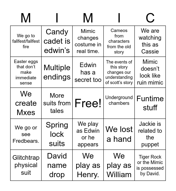 This bingo card has a free space and 24 words: Spring lock suits, David name drop, Edwin has a secret too, Glitchtrap physical suit, We are watching this as Cassie, We go to fallfest/fallfest fire, Easter eggs that don’t make immediate sense, Candy cadet is edwin’s, Underground chambers, We play as Edwin or he appears, The events of this story changes our understanding of scott’s story, We create Mxes, We lost a hand, Jackie is related to the puppet, Multiple endings, We play as William, Funtime stuff, Mimic changes costume in real time., Mimic doesn’t look like ruin mimic, More suits from tales, Tiger Rock or the Mimic is possessed by David., We go or see Fredbears., Cameos from characters from the old story and We play as Henry..