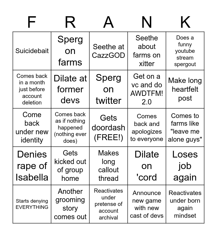 This bingo card has a free space and 24 words: Gets kicked out of group home, Another grooming story comes out, Sperg on twitter, Starts denying EVERYTHING, Does a funny youtube stream spergout, Suicidebait, Comes back in a month just before account deletion, Sperg on farms, Comes back and apologizes to everyone, Makes long callout thread, Get on a vc and do AWDTFM! 2.0, Come back under new identity, Dilate on 'cord, Loses job again, Dilate at former devs, Announce new game with new cast of devs, Comes to farms like "leave me alone guys", Seethe at CazzGOD, Make long heartfelt post, Comes back as if nothing happened (nothing ever does), Reactivates under born again mindset, Denies rape of Isabella, Seethe about farms on xitter and Reactivates under pretense of account archival.