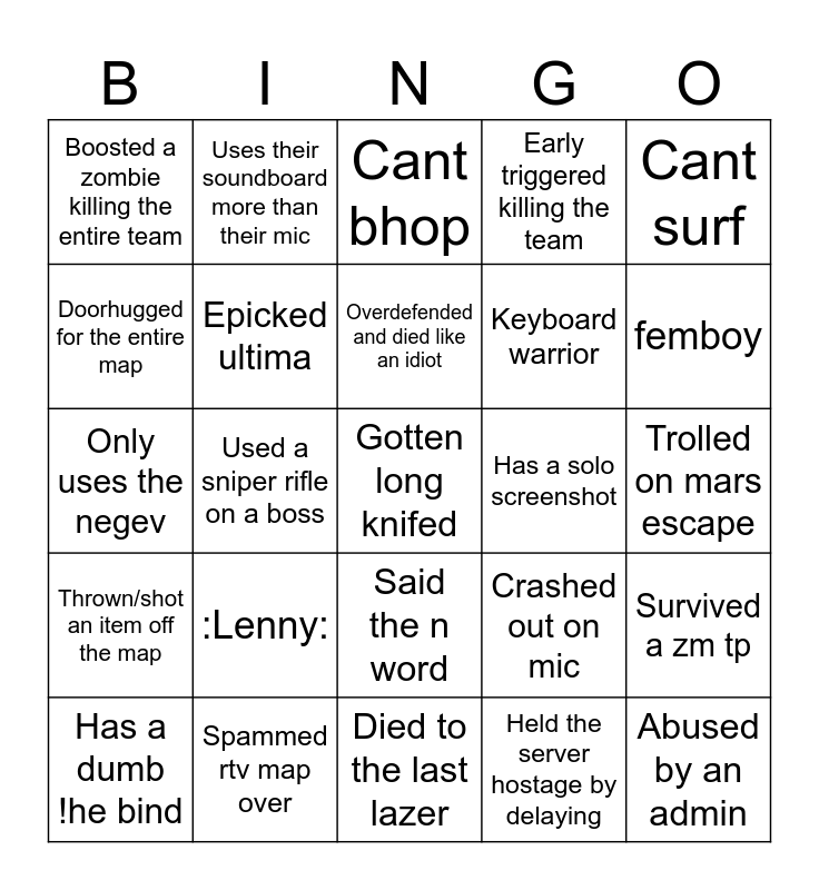 This bingo card has 25 words: :Lenny:, Died to the last lazer, Overdefended and died like an idiot, Has a dumb !he bind, Cant surf, Boosted a zombie killing the entire team, Doorhugged for the entire map, Uses their soundboard more than their mic, Has a solo screenshot, Said the n word, Keyboard warrior, Only uses the negev, Crashed out on mic, Survived a zm tp, Epicked ultima, Abused by an admin, Trolled on mars escape, Cant bhop, femboy, Used a sniper rifle on a boss, Gotten long knifed, Spammed rtv map over, Thrown/shot an item off the map, Early triggered killing the team and Held the server hostage by delaying.
