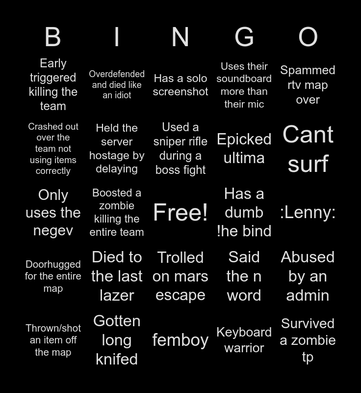 This bingo card has a free space and 24 words: Died to the last lazer, Gotten long knifed, Used a sniper rifle during a boss fight, Thrown/shot an item off the map, Spammed rtv map over, Early triggered killing the team, Crashed out over the team not using items correctly, Overdefended and died like an idiot, Has a dumb !he bind, Trolled on mars escape, Epicked ultima, Only uses the negev, Said the n word, Abused by an admin, Held the server hostage by delaying, Keyboard warrior, :Lenny:, Has a solo screenshot, Cant surf, Boosted a zombie killing the entire team, Survived a zombie tp, Doorhugged for the entire map, Uses their soundboard more than their mic and femboy.