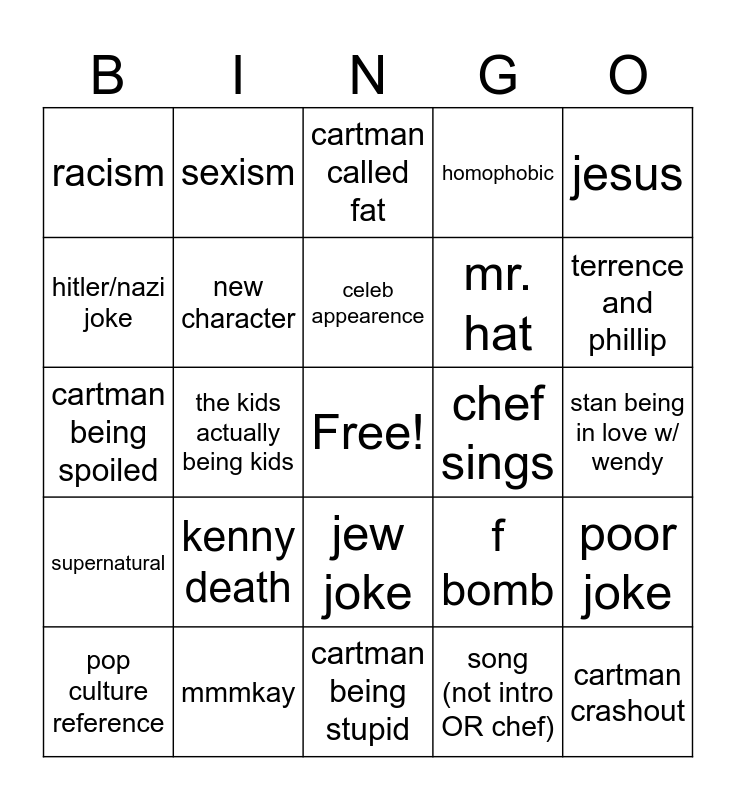 This bingo card has a free space and 24 words: kenny death, mmmkay, celeb appearence, pop culture reference, jesus, racism, hitler/nazi joke, sexism, chef sings, jew joke, mr. hat, cartman being spoiled, f bomb, poor joke, new character, song (not intro OR chef), stan being in love w/ wendy, cartman called fat, terrence and phillip, the kids actually being kids, cartman crashout, supernatural, homophobic and cartman being stupid.