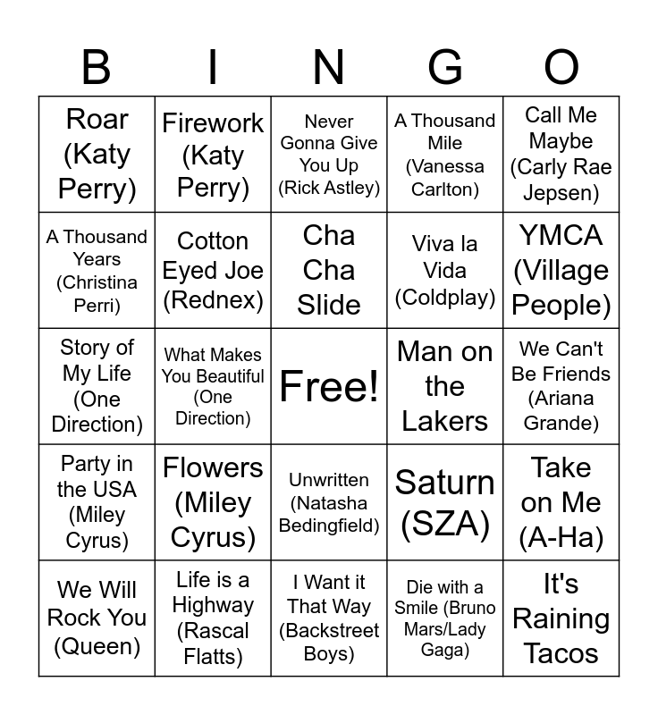 This bingo card has a free space and 30 words: Life is a Highway (Rascal Flatts), Sunroof (Nicky Youre & Dazy), What Makes You Beautiful (One Direction), Happy (Pharrell Williams), Roar (Katy Perry), Never Gonna Give You Up (Rick Astley), Cotton Eyed Joe (Rednex), Unwritten (Natasha Bedingfield), Man on the Lakers, I Want it That Way (Backstreet Boys), We Can't Be Friends (Ariana Grande), It's Raining Tacos, Die with a Smile (Bruno Mars/Lady Gaga), Waka Waka (Shakira), YMCA (Village People), Dancing in the Dark (Rihanna), Saturn (SZA), Party in the USA (Miley Cyrus), Flowers (Miley Cyrus), Call Me Maybe (Carly Rae Jepsen), Story of My Life (One Direction), Best Day of My Life (American Authors), Firework (Katy Perry), Viva la Vida (Coldplay), A Thousand Years (Christina Perri), A Thousand Mile (Vanessa Carlton), Take on Me (A-Ha), We Will Rock You (Queen), Cha Cha Slide and Love Story (Taylor Swift).
