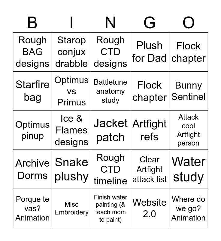 This bingo card has 25 words: Snake plushy, Finish water painting (& teach mom to paint), Battletune anatomy study, Porque te vas? Animation, Flock chapter, Rough BAG designs, Starfire bag, Starop conjux drabble, Artfight refs, Rough CTD timeline, Flock chapter, Optimus pinup, Clear Artfight attack list, Water study, Optimus vs Primus, Where do we go? Animation, Attack cool Artfight person, Rough CTD designs, Bunny Sentinel, Ice & Flames designs, Jacket patch, Misc Embroidery, Archive Dorms, Plush for Dad and Website 2.0.