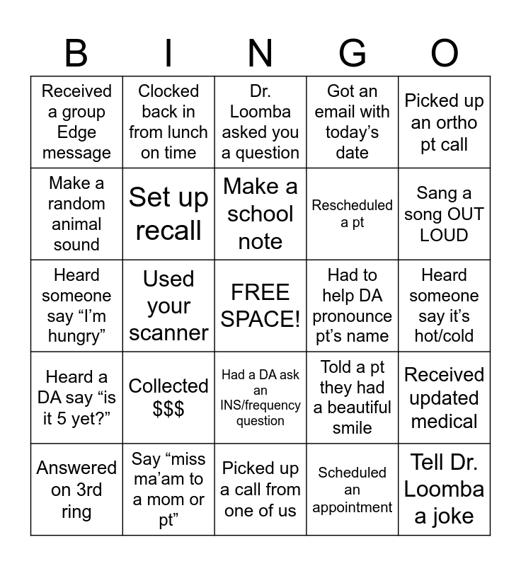 This bingo card has a free space and 24 words: Answered on 3rd ring, Collected $$$, Make a school note, Scheduled an appointment, Picked up an ortho pt call, Received a group Edge message, Clocked back in from lunch on time, Dr. Loomba asked you a question, Had to help DA pronounce pt’s name, Heard someone say it’s hot/cold, Heard someone say “I’m hungry”, Set up recall, Told a pt they had a beautiful smile, Received updated medical, Make a random animal sound, Say “miss ma’am to a mom or pt”, Picked up a call from one of us, Got an email with today’s date, Sang a song OUT LOUD, Heard a DA say “is it 5 yet?”, Used your scanner, Had a DA ask an INS/frequency question, Rescheduled a pt and Tell Dr. Loomba a joke.