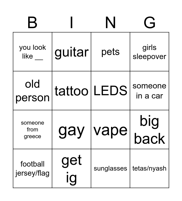 This bingo card has 16 words: get ig, big back, pets, you look like __, someone from greece, guitar, vape, sunglasses, old person, tattoo, football jersey/flag, girls sleepover, gay, someone in a car, LEDS and tetas/nyash.