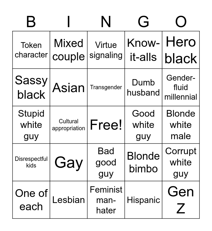 This bingo card has a free space and 24 words: Gay, Lesbian, Transgender, One of each, Hero black, Token character, Sassy black, Mixed couple, Good white guy, Bad good guy, Dumb husband, Stupid white guy, Blonde bimbo, Corrupt white guy, Asian, Hispanic, Blonde white male, Virtue signaling, Gender-fluid millennial, Cultural appropriation, Gen Z, Disrespectful kids, Know-it-alls and Feminist man-hater.
