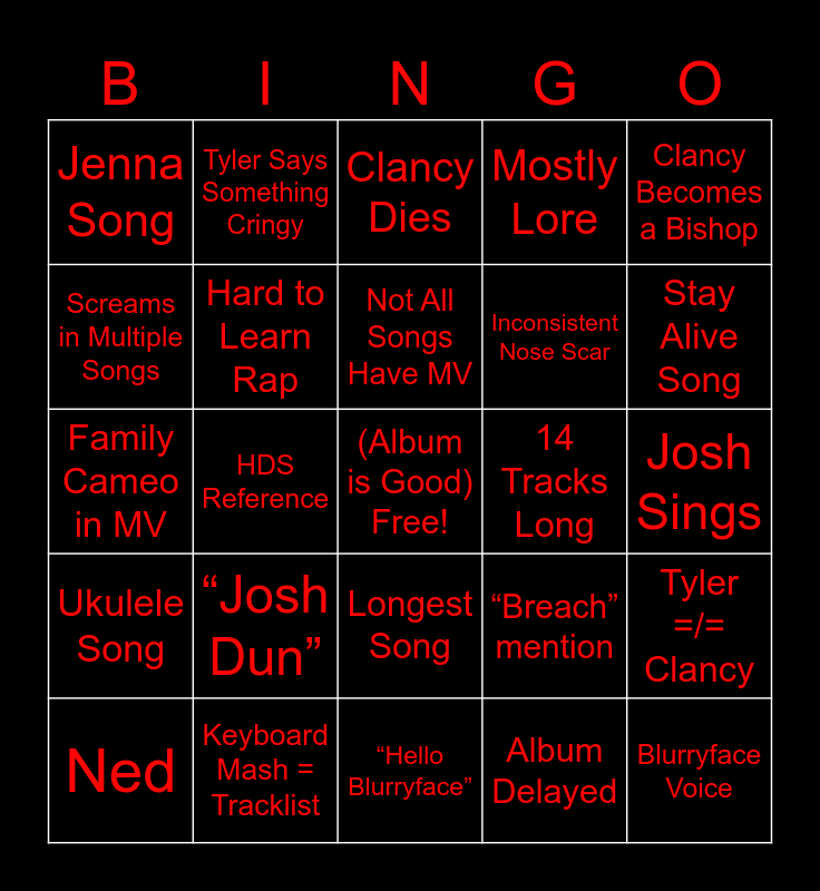 This bingo card has a free space and 24 words: “Josh Dun”, Keyboard Mash = Tracklist, Not All Songs Have MV, Ned, Clancy Becomes a Bishop, Jenna Song, Screams in Multiple Songs, Tyler Says Something Cringy, 14 Tracks Long, Longest Song, Inconsistent Nose Scar, Family Cameo in MV, “Breach” mention, Tyler =/= Clancy, Hard to Learn Rap, Album Delayed, Josh Sings, Clancy Dies, Stay Alive Song, HDS Reference, Blurryface Voice, Ukulele Song, Mostly Lore and “Hello Blurryface”.