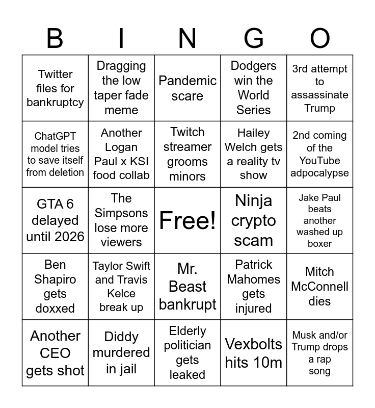 This bingo card has a free space and 24 words: Taylor Swift and Travis Kelce break up, Diddy murdered in jail, Twitch streamer grooms minors, Another CEO gets shot, 3rd attempt to assassinate Trump, Twitter files for bankruptcy, ChatGPT model tries to save itself from deletion, Dragging the low taper fade meme, Ninja crypto scam, Mr. Beast bankrupt, Hailey Welch gets a reality tv show, GTA 6 delayed until 2026, Patrick Mahomes gets injured, Mitch McConnell dies, Another Logan Paul x KSI food collab, Vexbolts hits 10m, Jake Paul beats another washed up boxer, Pandemic scare, 2nd coming of the YouTube adpocalypse, The Simpsons lose more viewers, Musk and/or Trump drops a rap song, Ben Shapiro gets doxxed, Dodgers win the World Series and Elderly politician gets leaked.
