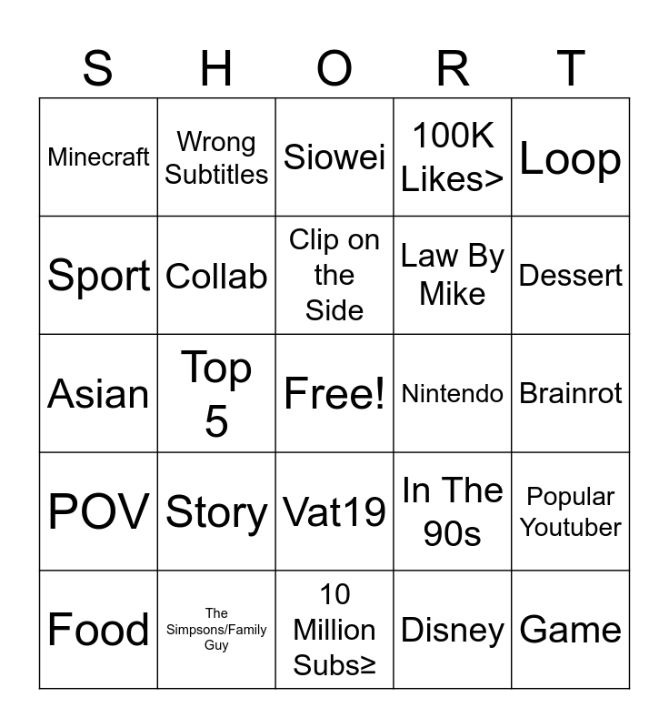 This bingo card has a free space and 24 words: Story, The Simpsons/Family Guy, Clip on the Side, Food, Loop, Minecraft, Sport, Wrong Subtitles, Nintendo, Vat19, Law By Mike, Asian, In The 90s, Popular Youtuber, Collab, Disney, Brainrot, Siowei, Dessert, Top 5, Game, POV, 100K Likes> and 10 Million Subs≥.