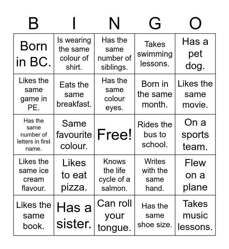 This bingo card has a free space and 24 words: Likes to eat pizza., Has a sister., Has the same colour eyes., Likes the same book., Has a pet dog., Born in BC., Likes the same game in PE., Is wearing the same colour of shirt., Rides the bus to school., Knows the life cycle of a salmon., Born in the same month., Has the same number of letters in first name., Writes with the same hand., Flew on a plane, Eats the same breakfast., Has the same shoe size., On a sports team., Has the same number of siblings., Likes the same movie., Same favourite colour., Takes music lessons., Likes the same ice cream flavour., Takes swimming lessons. and Can roll your tongue..