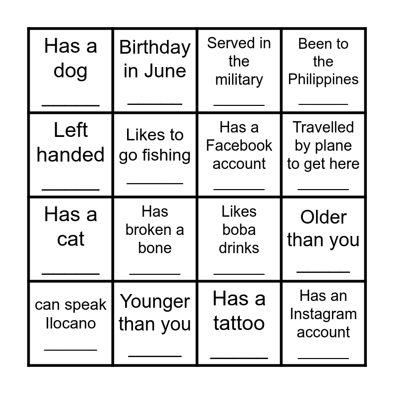 This bingo card has 16 words: Younger than you _____, Older than you _____, Served in the military ______, Has a dog _____, Has a cat _____, Birthday in June _____, Likes boba drinks ______, Has a tattoo _____, Left handed _____, Likes to go fishing ______, can speak Ilocano ______, Been to the Philippines ______, Has broken a bone ______, Travelled by plane to get here ______, Has a Facebook account ______ and Has an Instagram account ______.