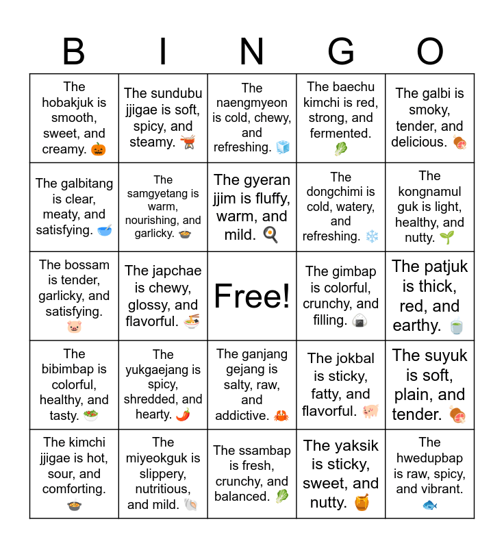 This bingo card has a free space and 33 words: The kimchi is spicy, tangy, and crunchy. 🌶️, The bulgogi is sweet, savory, and juicy. 🥩, The japchae is chewy, glossy, and flavorful. 🍜, The tteokbokki is spicy, chewy, and saucy. 🔥, The bibimbap is colorful, healthy, and tasty. 🥗, The samgyetang is warm, nourishing, and garlicky. 🍲, The galbi is smoky, tender, and delicious. 🍖, The kimchi jjigae is hot, sour, and comforting. 🍲, The sundubu jjigae is soft, spicy, and steamy. 🫕, The doenjang jjigae is earthy, salty, and rich. 🍚, The gyeran jjim is fluffy, warm, and mild. 🍳, The naengmyeon is cold, chewy, and refreshing. 🧊, The mandu is crispy, savory, and juicy. 🥟, The jeon is crispy, golden, and greasy. 🫓, The gimbap is colorful, crunchy, and filling. 🍙, The kongnamul guk is light, healthy, and nutty. 🌱, The miyeokguk is slippery, nutritious, and mild. 🐚, The bossam is tender, garlicky, and satisfying. 🐷, The yukgaejang is spicy, shredded, and hearty. 🌶️, The jokbal is sticky, fatty, and flavorful. 🐖, The ganjang gejang is salty, raw, and addictive. 🦀, The pajeon is savory, oily, and crispy. 🧅, The hobakjuk is smooth, sweet, and creamy. 🎃, The patjuk is thick, red, and earthy. 🍵, The ssambap is fresh, crunchy, and balanced. 🥬, The hwedupbap is raw, spicy, and vibrant. 🐟, The baechu kimchi is red, strong, and fermented. 🥬, The dongchimi is cold, watery, and refreshing. ❄️, The galbitang is clear, meaty, and satisfying. 🥣, The suyuk is soft, plain, and tender. 🍖, The tteokguk is chewy, white, and warm. 🍽️, The yaksik is sticky, sweet, and nutty. 🍯 and The hotteok is warm, gooey, and sweet. 🥞.