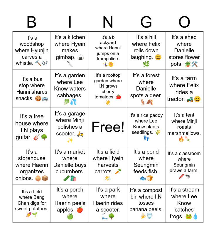 This bingo card has a free space and 33 words: Itβs a greenhouse where Hanni picks basil leaves. πΏπ, Itβs a barn where Felix feeds baby goats. ππ₯, Itβs a garage where Minji polishes a scooter. π΅β¨, Itβs a tree house where Hyunjin writes a poem. βοΈπ³, Itβs a storehouse where Haerin organizes onions. π§ π¦, Itβs a garden where Lee Know waters cabbages. π₯¬π¦, Itβs a shed where Danielle stores flower pots. πͺ΄π οΈ, Itβs a field where Bang Chan digs for sweet potatoes. π π±, Itβs a kitchen where Hyein makes gimbap. ππͺ, Itβs a playground where Seungmin plays tag. πββοΈπ, Itβs a rooftop garden where I.N grows cherry tomatoes. π βοΈ, Itβs a backyard where Hanni jumps on a trampoline. π€ΈββοΈπΌ, Itβs a chicken coop where Hyunjin collects eggs. π₯π, Itβs a hillside where Minji picks wildflowers. πΌπΏ, Itβs a rice paddy where Lee Know plants seedlings. πΎπ£, Itβs a farm where Felix rides a tractor. ππ, Itβs a porch where Haerin peels apples. ππ, Itβs a tree house where I.N plays guitar. πΈπ³, Itβs a market where Danielle buys cucumbers. π₯ποΈ, Itβs a pond where Seungmin feeds fish. ππ, Itβs a field where Hyein harvests carrots. π₯π€οΈ, Itβs a stable where Bang Chan brushes the pony. π΄π§½, Itβs a woodshop where Hyunjin carves a whistle. π¨πΆ, Itβs a tent where Minji roasts marshmallows. π₯π‘, Itβs a park where Haerin rides a scooter. π΄π³, Itβs a stream where Lee Know catches frogs. πΈπ§, Itβs a hill where Felix rolls down laughing. ππΏ, Itβs a forest where Danielle spots a deer. π¦π, Itβs a bus stop where Hanni shares snacks. πͺπ, Itβs a classroom where Seungmin draws a farm. ποΈπ, Itβs a flower field where Hyein takes selfies. πΈπ·, Itβs a compost bin where I.N tosses banana peels. πποΈ and Itβs a wagon where Hyunjin delivers vegetables. ππ₯¬.