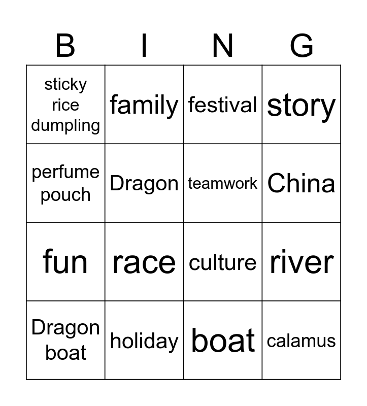 This bingo card has 17 words: boat, Dragon boat, festival, sticky rice dumpling, race, story, river, teamwork, China, Dragon, holiday, culture, perfume pouch, family, fun, wormwood and calamus.