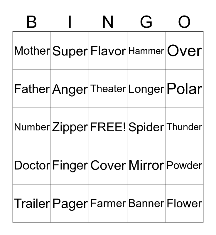 This bingo card has a free space and 24 words: Finger, Pager, Theater, Trailer, Over, Mother, Father, Super, Spider, Cover, Longer, Number, Mirror, Powder, Anger, Banner, Thunder, Flavor, Polar, Zipper, Flower, Doctor, Hammer and Farmer.
