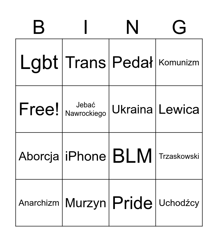 This bingo card has 16 words: Murzyn, Trzaskowski, Pedał, Lgbt, Aborcja, Trans, BLM, Pride, Free!, Jebać Nawrockiego, Anarchizm, Komunizm, iPhone, Lewica, Ukraina and Uchodźcy.