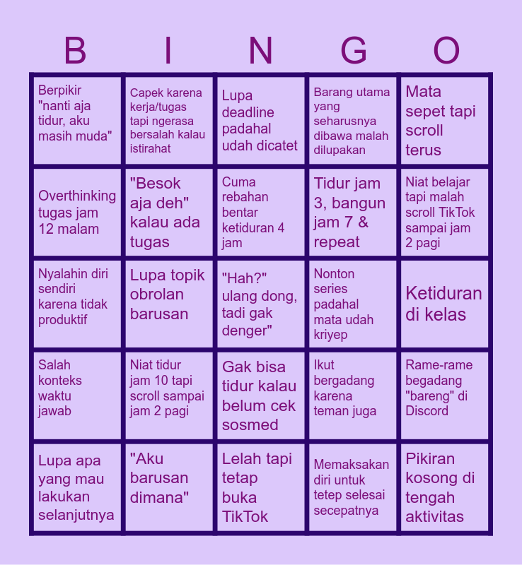 This bingo card has 25 words: Niat tidur jam 10 tapi scroll sampai jam 2 pagi, Lelah tapi tetap buka TikTok, Cuma rebahan bentar ketiduran 4 jam, Lupa apa yang mau lakukan selanjutnya, Mata sepet tapi scroll terus, Berpikir "nanti aja tidur, aku masih muda", Overthinking tugas jam 12 malam, Capek karena kerja/tugas tapi ngerasa bersalah kalau istirahat, Nonton series padahal mata udah kriyep, Gak bisa tidur kalau belum cek sosmed, Tidur jam 3, bangun jam 7 & repeat, Nyalahin diri sendiri karena tidak produktif, Ikut bergadang karena teman juga, Rame-rame begadang "bareng" di Discord, "Besok aja deh" kalau ada tugas, Pikiran kosong di tengah aktivitas, Ketiduran di kelas, Lupa deadline padahal udah dicatet, Niat belajar tapi malah scroll TikTok sampai jam 2 pagi, Lupa topik obrolan barusan, "Hah?" ulang dong, tadi gak denger", "Aku barusan dimana", Salah konteks waktu jawab, Barang utama yang seharusnya dibawa malah dilupakan and Memaksakan diri untuk tetep selesai secepatnya.