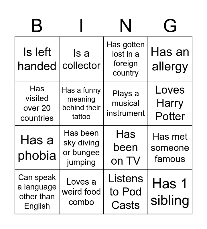 This bingo card has 16 words: Loves a weird food combo, Has met someone famous, Has gotten lost in a foreign country, Is left handed, Has a phobia, Is a collector, Has been on TV, Listens to Pod Casts, Has visited over 20 countries, Has a funny meaning behind their tattoo, Can speak a language other than English, Has an allergy, Has been sky diving or bungee jumping, Loves Harry Potter, Plays a musical instrument and Has 1 sibling.