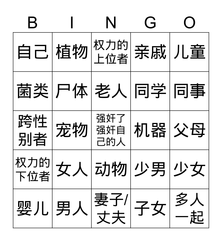 This bingo card has a free space and 24 words: 女人, 男人, 老人, 婴儿, 儿童, 自己, 菌类, 植物, 机器, 动物, 同学, 跨性别者, 少男, 少女, 尸体, 子女, 父母, 权力的上位者, 同事, 宠物, 多人一起, 权力的下位者, 亲戚 and 妻子/丈夫.