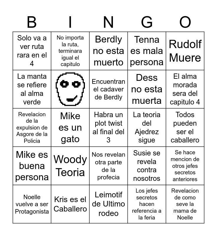 This bingo card has 1 images, a free space and 23 words: Woody Teoria, Kris es el Caballero, Encuentran el cadaver de Berdly, Noelle vuelve a ser Protagonista, Rudolf Muere, Solo va a ver ruta rara en el 4, La manta se refiere al alma verde, No importa la ruta, terminara igual el capitulo, La teoria del Ajedrez sigue, Nos revelan otra parte de la profecia, Dess no esta muerta, Revelacion de la expulsion de Asgore de la Policia, Susie se revela contra nosotros, Se hace mencion de otros jefes secretos anteriores, Los jefes secretos hacen referencia a la feria, Todos pueden ser el caballero, Berdly no esta muerto, El alma morada sera del capitulo 4, Mike es un gato, Revelacion de como seve la mama de Noelle, Mike es buena persona, Tenna es mala persona and Leimotif de Ultimo rodeo.
