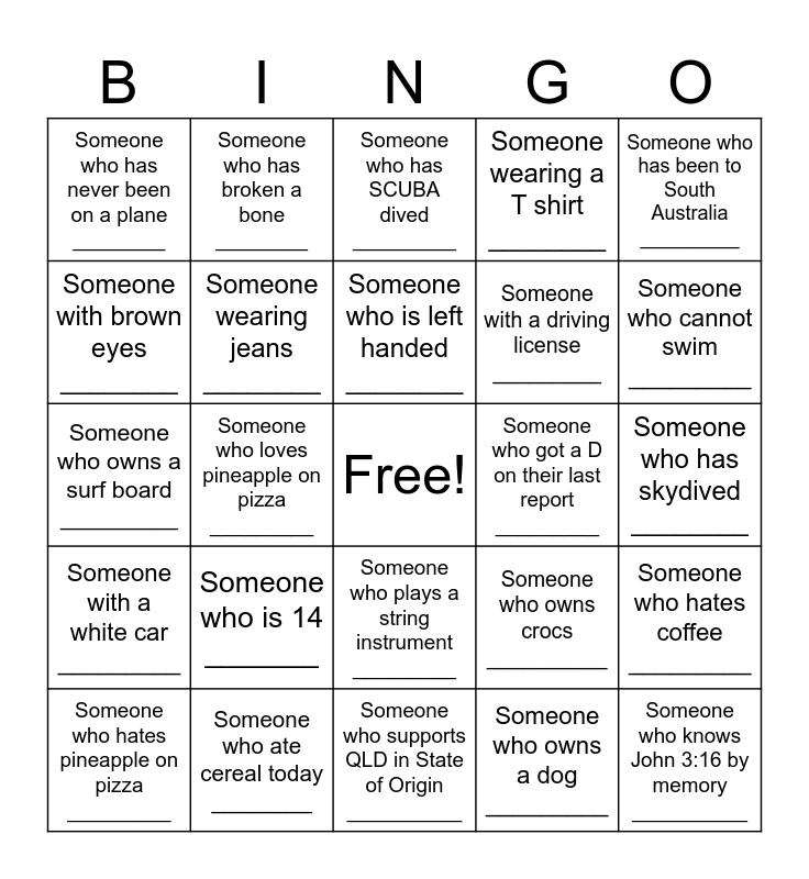 This bingo card has a free space and 24 words: Someone who is 14 _______, Someone who ate cereal today ________, Someone who is left handed ________, Someone who hates pineapple on pizza _________, Someone who has been to South Australia _________, Someone who has never been on a plane ________, Someone with brown eyes ________, Someone who has broken a bone ________, Someone who got a D on their last report _________, Someone who plays a string instrument _________, Someone with a driving license _________, Someone who owns a surf board _________, Someone who owns crocs __________, Someone who hates coffee _________, Someone wearing jeans ________, Someone who owns a dog _________, Someone who has skydived ________, Someone who has SCUBA dived _________, Someone who cannot swim _________, Someone who loves pineapple on pizza _________, Someone who knows John 3:16 by memory __________, Someone with a white car _________, Someone wearing a T shirt ________ and Someone who supports QLD in State of Origin __________.
