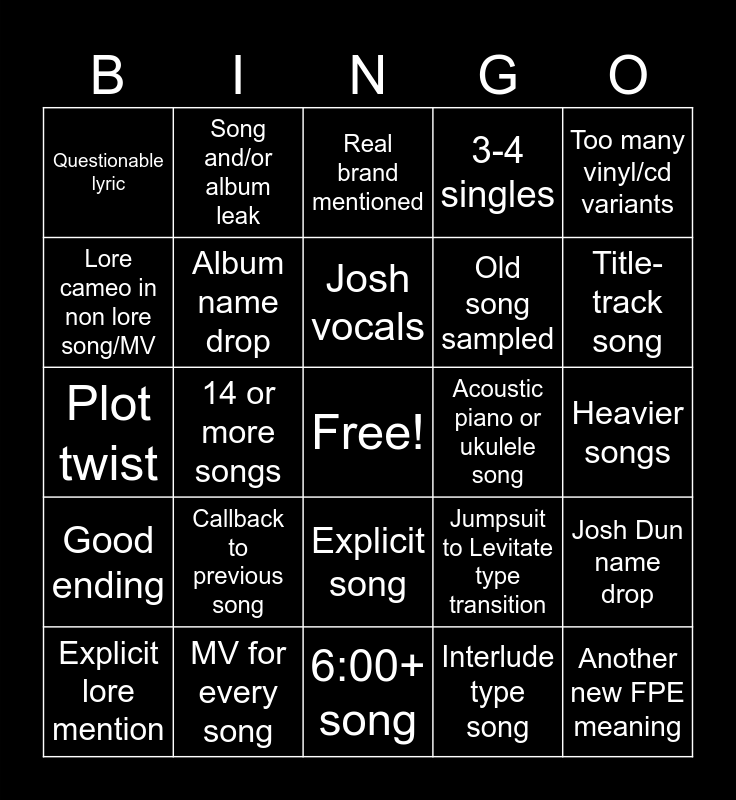 This bingo card has a free space and 24 words: Callback to previous song, MV for every song, Josh vocals, Explicit lore mention, Too many vinyl/cd variants, Questionable lyric, Lore cameo in non lore song/MV, Song and/or album leak, Acoustic piano or ukulele song, Explicit song, Old song sampled, Plot twist, Jumpsuit to Levitate type transition, Josh Dun name drop, Album name drop, Interlude type song, Heavier songs, Real brand mentioned, Title-track song, 14 or more songs, Another new FPE meaning, Good ending, 3-4 singles and 6:00+ song.