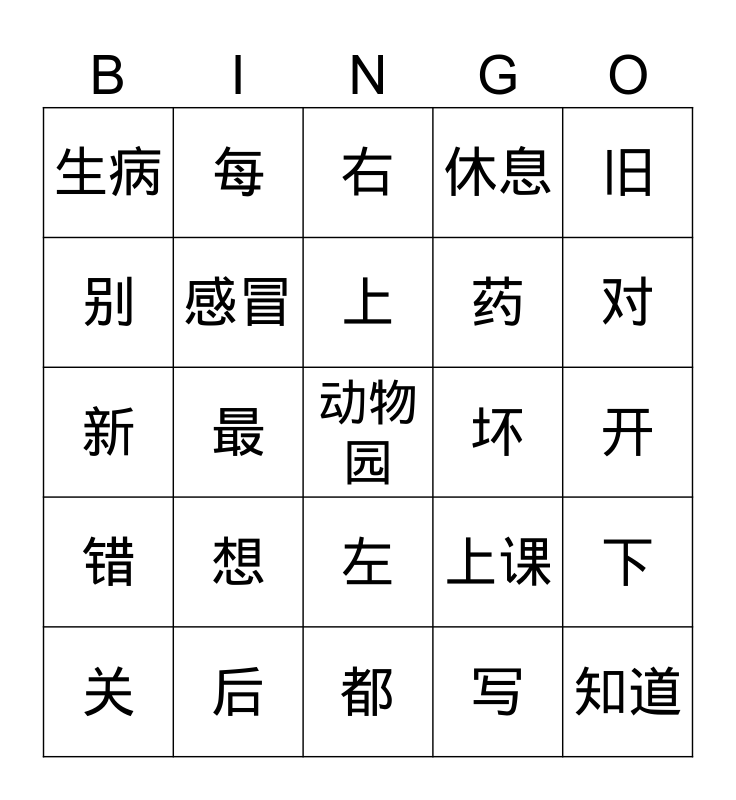 This bingo card has a free space and 29 words: 关, 问, 最, 前, 生病, 右, 感冒, 想, 坏, 后, 开, 知道, 都, 写, 对, 听, 左, 错, 旧, 新, 上课, 疼, 药, 别, 休息, 每, 下, 上 and 次.