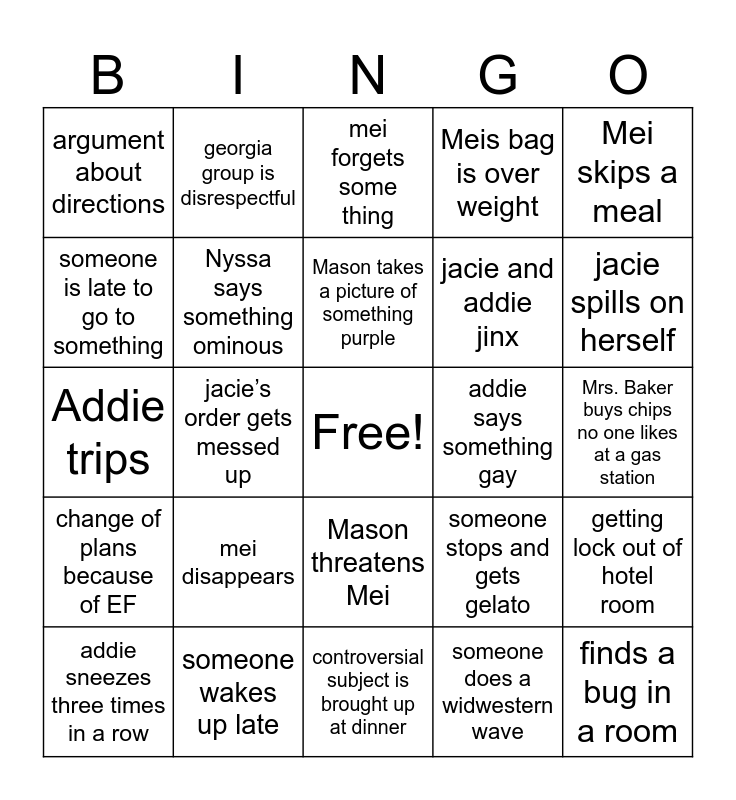 This bingo card has a free space and 35 words: mason gets lost, sees a pickpocketer, jacie gets sunburnt, Nyssa says something ominous, Mason threatens Mei, Meis bag is over weight, someone is late to go to something, Mrs. baker pays for everyone, Mason takes a picture of something purple, Nyssa says something about gelato, Addie trips, Mei skips a meal, someone gets hurt, Violet puts her hair up in a bun, argument about directions, addie says something gay, someone does a widwestern wave, jacie’s order gets messed up, change of plans because of EF, finds a bug in a room, someone stops and gets gelato, addie sneezes three times in a row, getting lock out of hotel room, someone wakes up late, mei forgets some thing, jacie spills on herself, we see a sign mainly in english, someone gets corrected on speaking a different language, jacie and addie jinx, Mrs. Baker buys chips no one likes at a gas station, addie gets interrogated, controversial subject is brought up at dinner, mei disappears, georgia group is disrespectful and addie makes a joke that only violet laughs at.