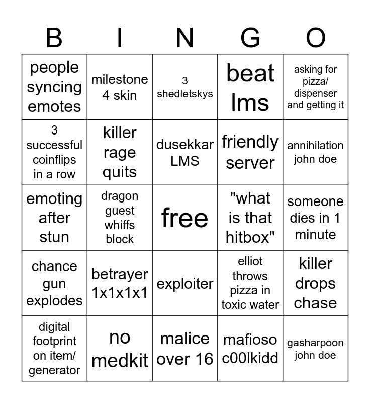 This bingo card has a free space and 24 words: betrayer 1x1x1x1, no medkit, dusekkar LMS, digital footprint on item/ generator, asking for pizza/ dispenser and getting it, people syncing emotes, 3 successful coinflips in a row, milestone 4 skin, "what is that hitbox", exploiter, friendly server, emoting after stun, elliot throws pizza in toxic water, killer drops chase, killer rage quits, mafioso c00lkidd, someone dies in 1 minute, 3 shedletskys, annihilation john doe, dragon guest whiffs block, gasharpoon john doe, chance gun explodes, beat lms and malice over 16.